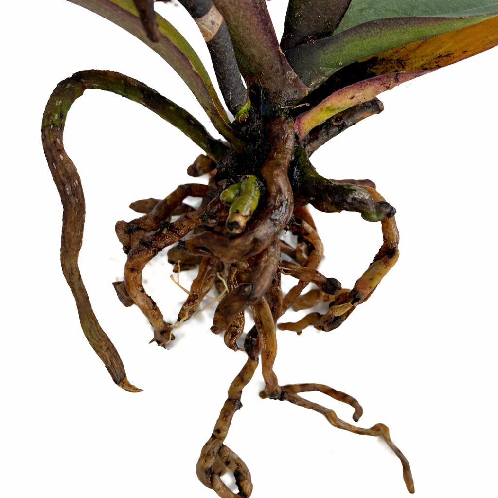 When an orchid gets root rot after watering, the roots turn brown or black and feel mushy instead of firm and green. You may also notice a bad smell, yellowing leaves, or drooping growth, which indicates the roots can no longer support the plant.